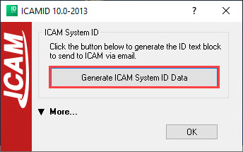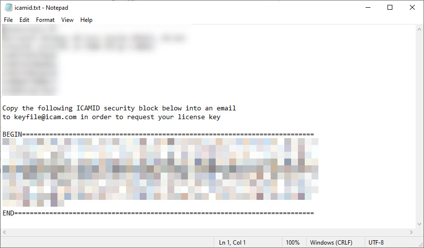 Please copy and paste the system ID, between the BEGIN and END to ICAM’s production department (keyfiles@fr.icam.com) to get a license key file. In your email, please include your Customer ID (CID) or Work Order # (ex: ICAO1234) in the subject line.
